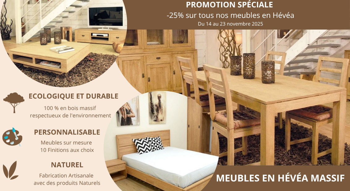 Pour vous accompagner dans une démarche respectueuse de l'environnement, nous vous proposons une large sélection de meubles en hévéa massif.