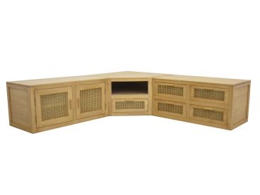Meuble TV d'angle Flora en hévéa massif de fabrication artisanale.