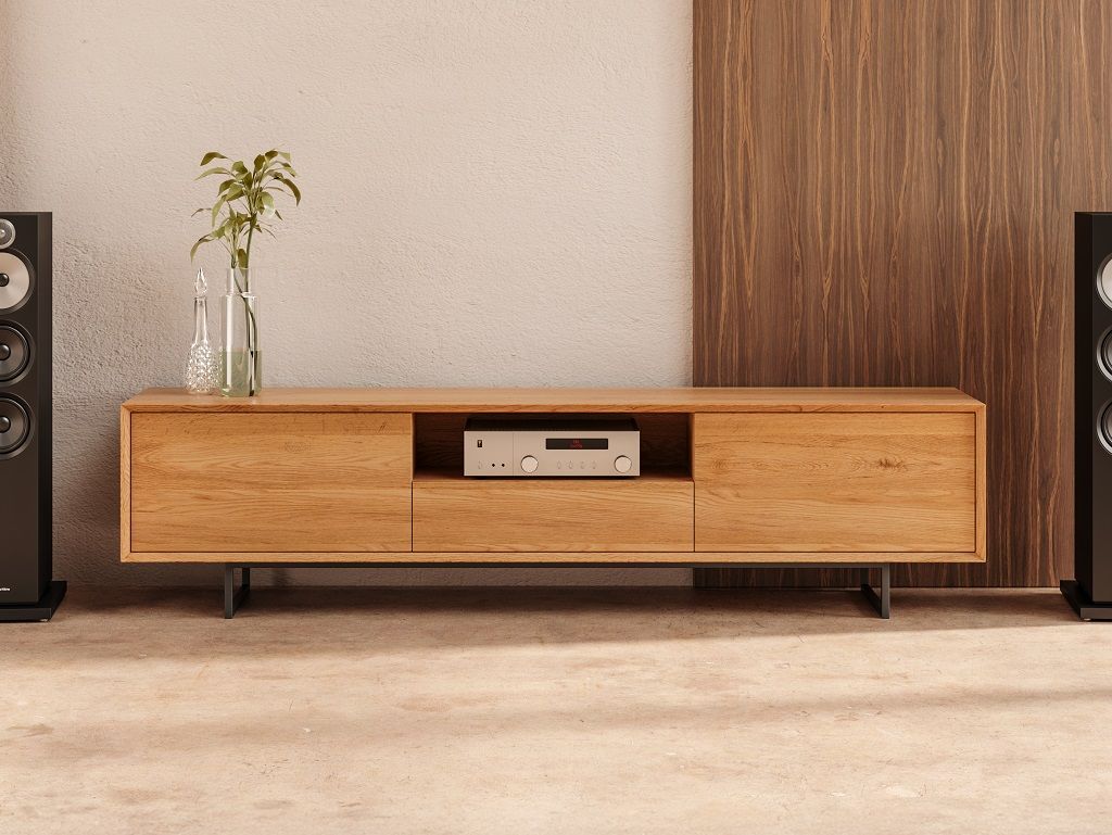 Meuble TV Winnipeg en Chêne Massif et pieds en métal noir.