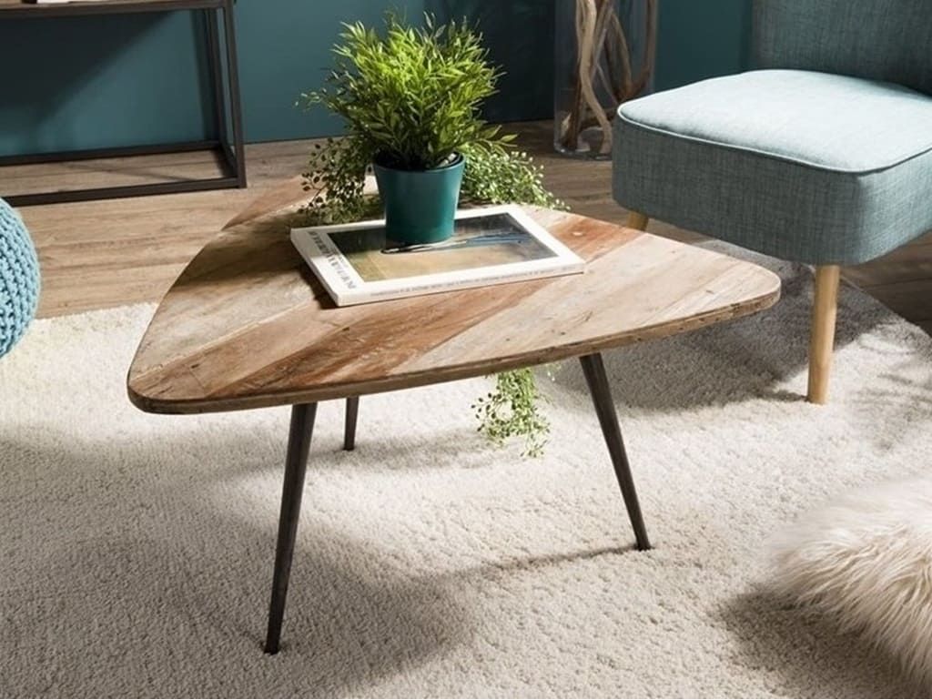 Table basse ovoide en teck recyclé et pieds en acier noir.